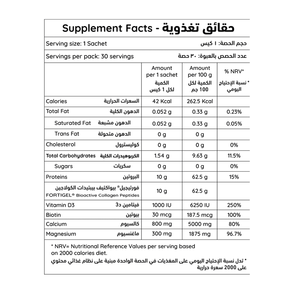 10 جرام من ببتيدات الكولاجين الحيوية Fortigel™، 800 ملغ من الكالسيوم، 1000 وحدة دولية من فيتامين د3 (كوليكالسيفيرول)، 30 ميكروغرام من البيوتين، و300 ملغ من المغنيسيوم.