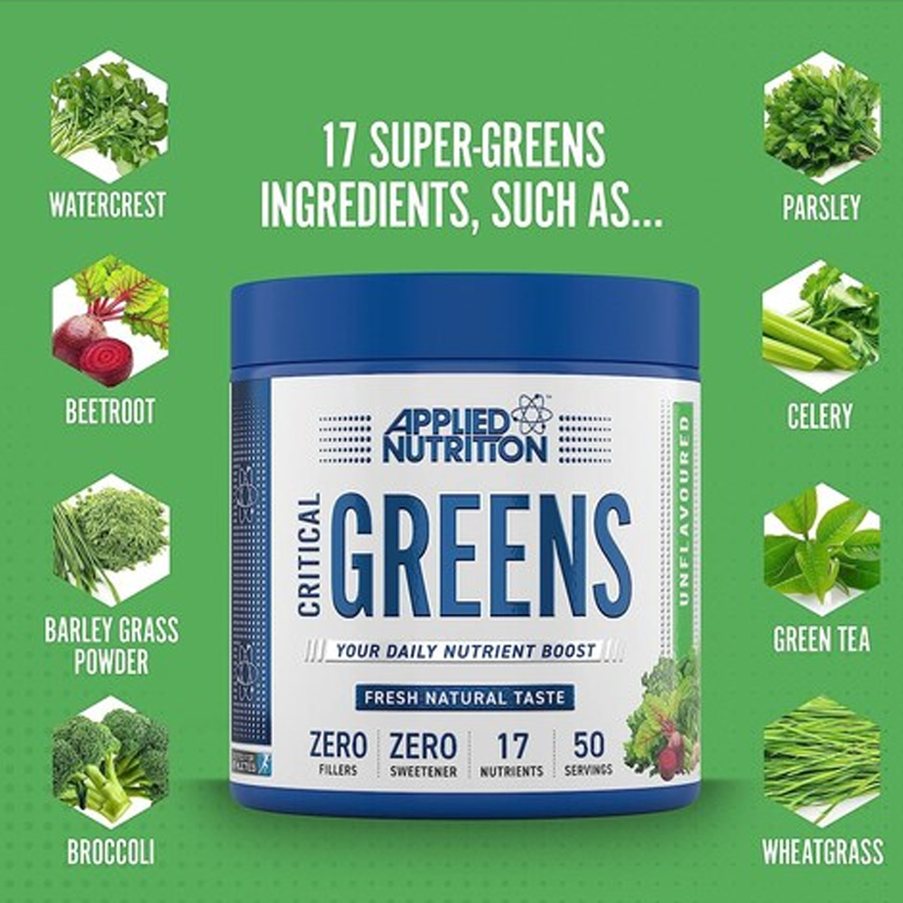 كريتيكال جرينز من ابلايد نيوترشن هو مزيج مركز يحتوي على 17 نوعًا من الخضروات والفواكه الغنية بالعناصر المفيدة مثل السبانخ واللفت والبروكلي والسبيرولينا.