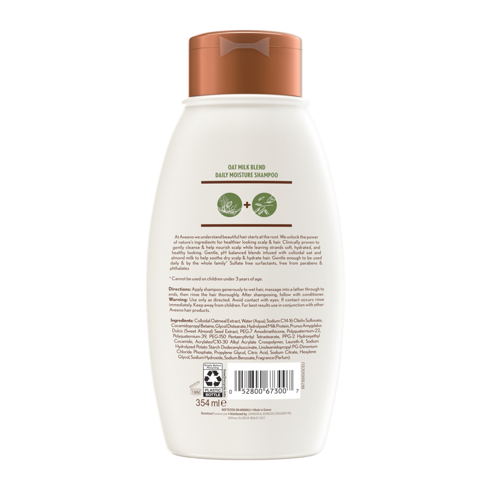 المكونات: مستخلص الشوفان الغروي، الماء (أكوا)، سلفات أوليفين الصوديوم C14-16، كوكاميدوبروبيل بيتائين، جلايكول ديستيرات، بروتين الحليب المتحلل، مستخلص بذور اللوز الحلو (Prunus Amygdalus Dulcis)، PEG-7 أموديميثيكون، بولي كواتيرنيوم-22، بولي كواتيرنيوم-39، PEG-150 بنتاجليسيريل تيتراستيرات، PPG-2 هيدروكسي إيثيل كوكاميد، أكريليتس/كروس بوليمر أكريليت ألكيل C10-30، لوريث-4، صوديوم نشا البطاطس المتحلل دوديسينيل سكسينات، لينولياميدوبروبيل PG-دي مونيوم كلوريد فوسفات، بروبيلين جلايكول، حمض الستريك، سترات الصوديوم، هيكسيلين جلايكول، هيدروكسيد الصوديوم، بنزوات الصوديوم، العطر (بارفان)