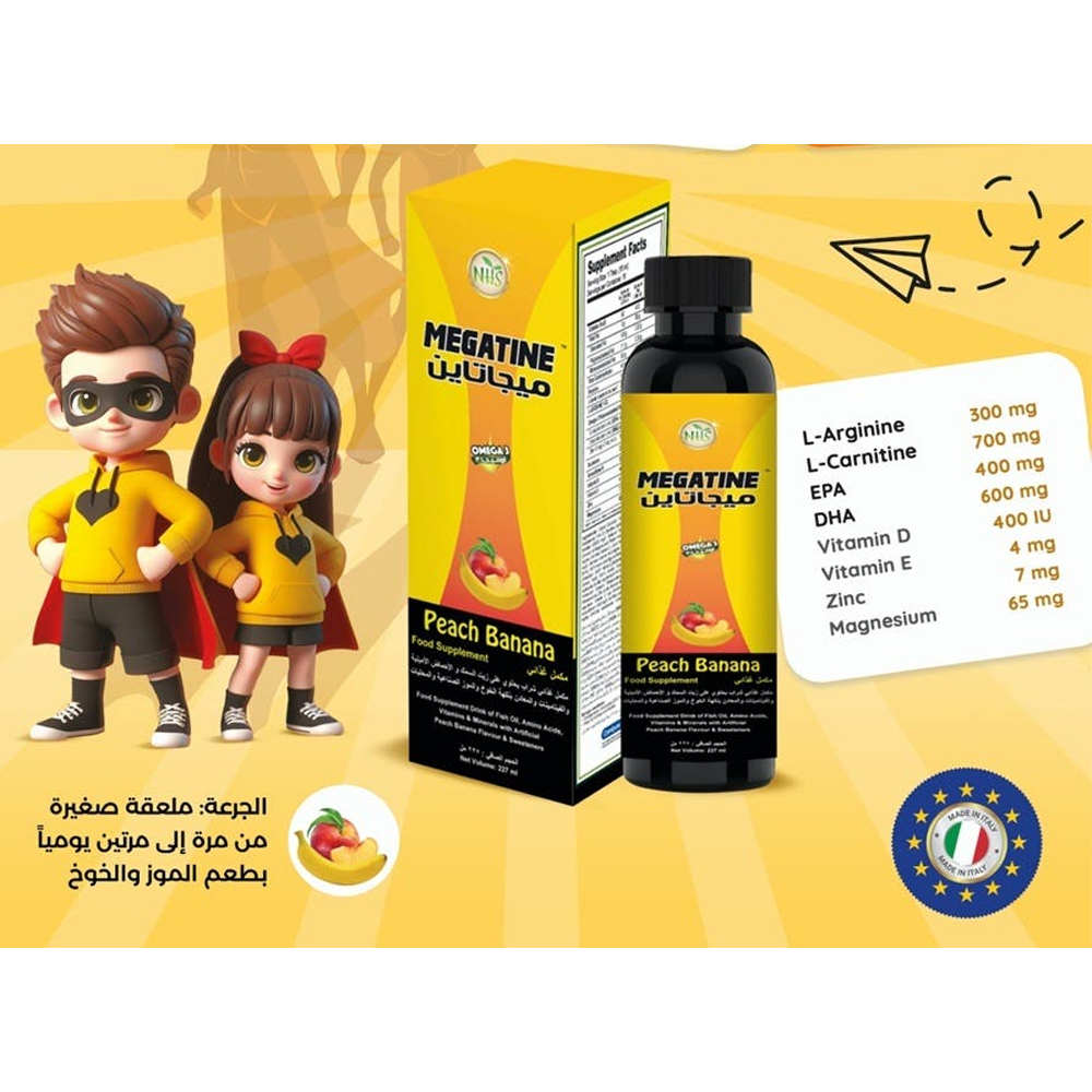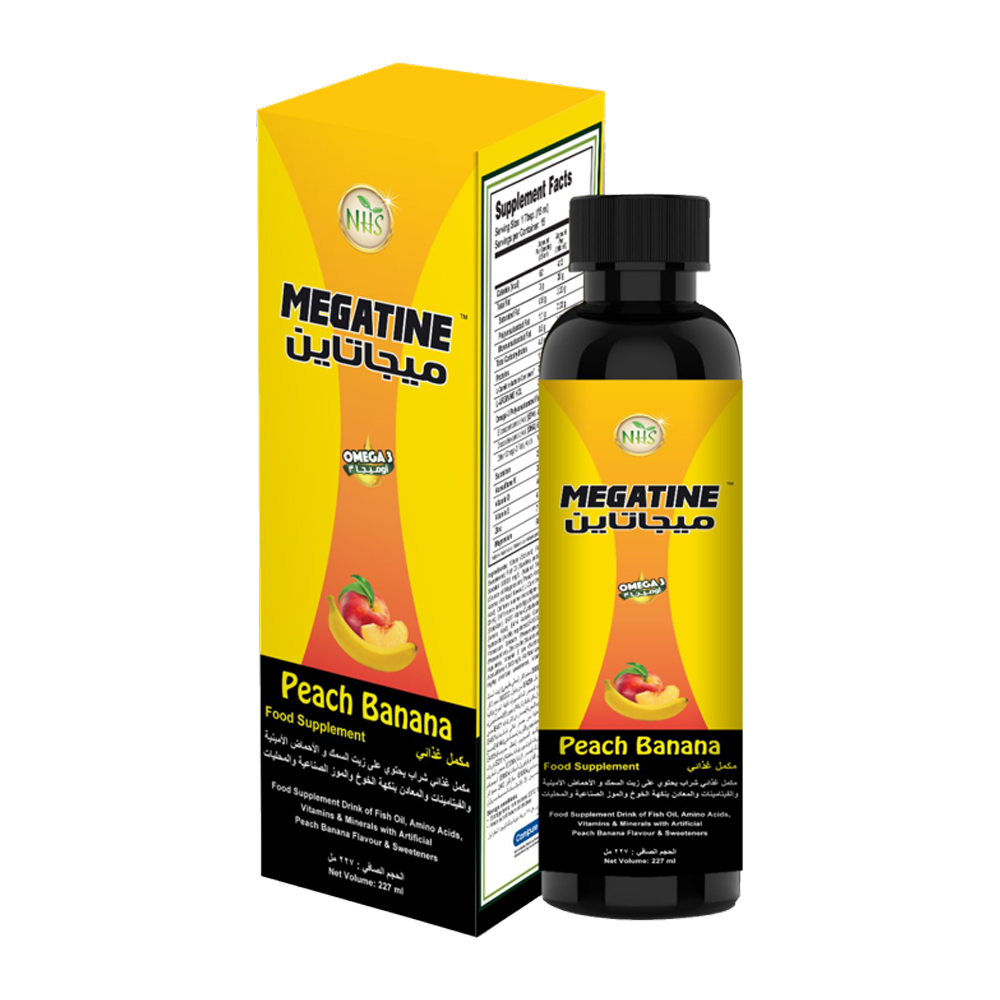 ان اتش اس ميجاتاين اوميجا 3 مع ال ارجينين بطعم الموز و الخوخ – 227 مل