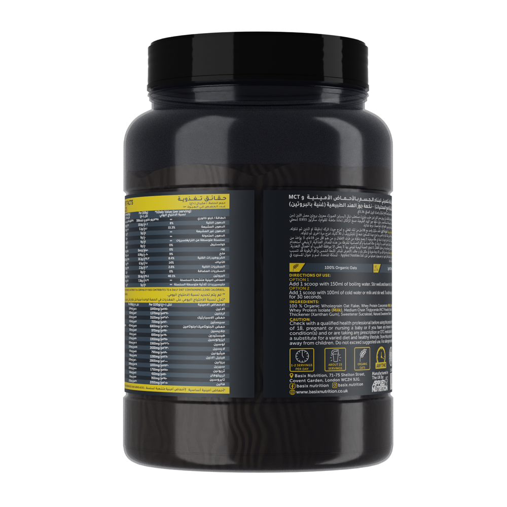 يحتوي على 100% من رقائق الشوفان الكاملة العضوية كمصدر وحيد للكربوهيدرات، مما يضمن توفير طاقة مستدامة.