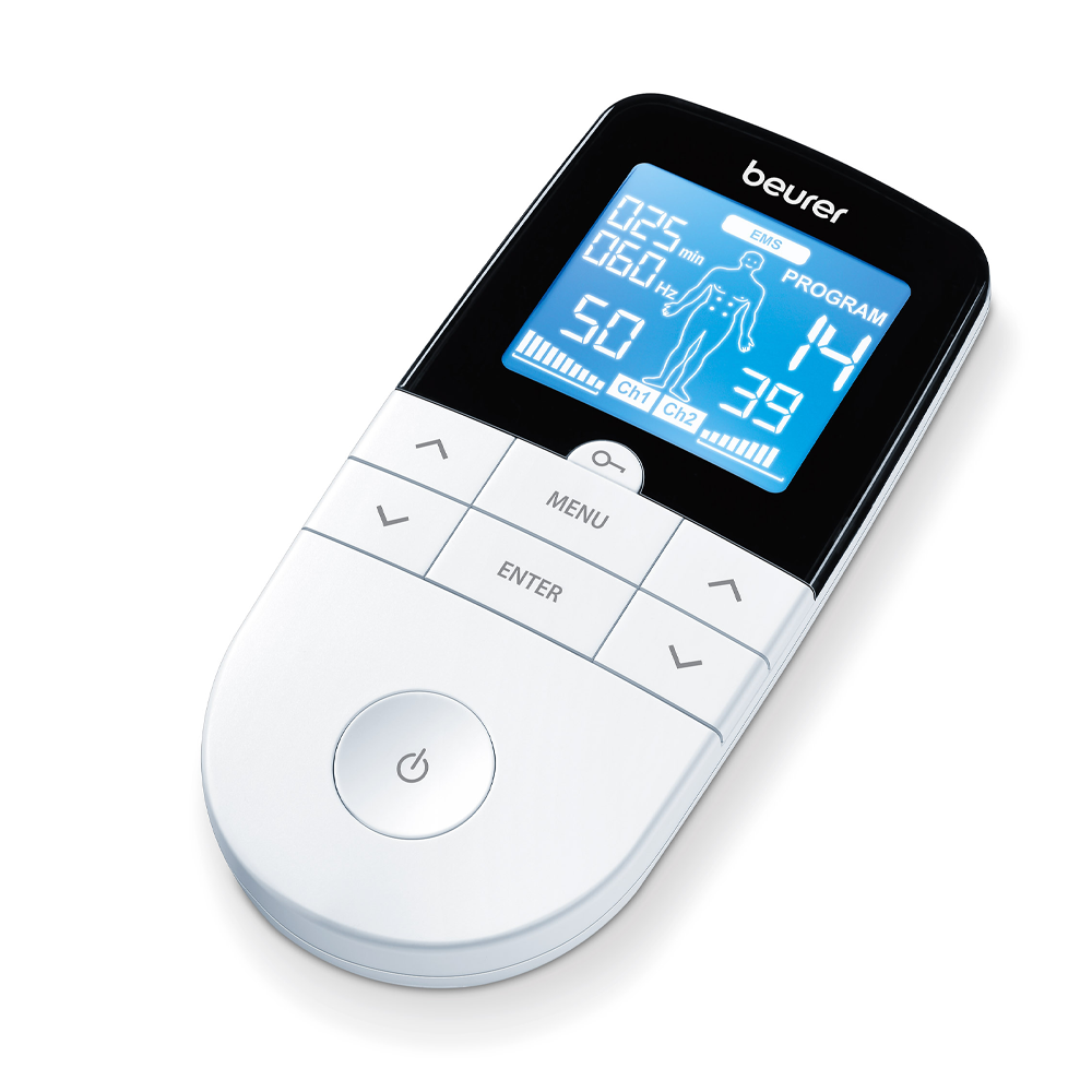 جهاز بيورير EM 49 هو جهاز رقمي متعدد الاستخدامات يجمع بين تقنيتي التحفيز الكهربائي TENS (التحفيز الكهربائي للعصب عبر الجلد) وEMS (التحفيز الكهربائي للعضلات).