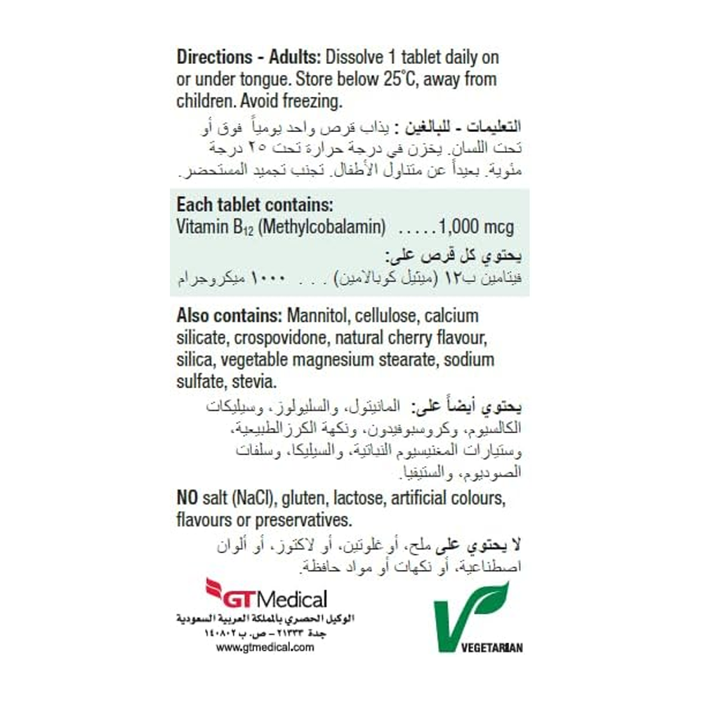 فيتامين ب 12 (ميثيل كوبالامين)، مانيتول، سليلوز، سيليكات الكالسيوم، كروسبوفيدون، نكهة الكرز الطبيعية، السيليكا، ستيرات المغنيس