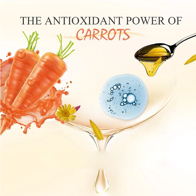 - يسهم مستخلص الجزر في توحيد لون البشرة بفضل عناصره المغذية ويقوم بتليين الجلد وتنقيته من الخلايا الميّتة لتحصلي على بشرة صحية ومشرقة.