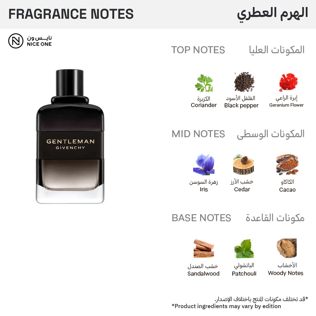 يبدأ العطر بمزيج حار من الفلفل الأسود، الجيرانيوم، والكزبرة، ليأخذك إلى قلبه المكون من الإيريس، الكاكاو، وخشب الأرز.