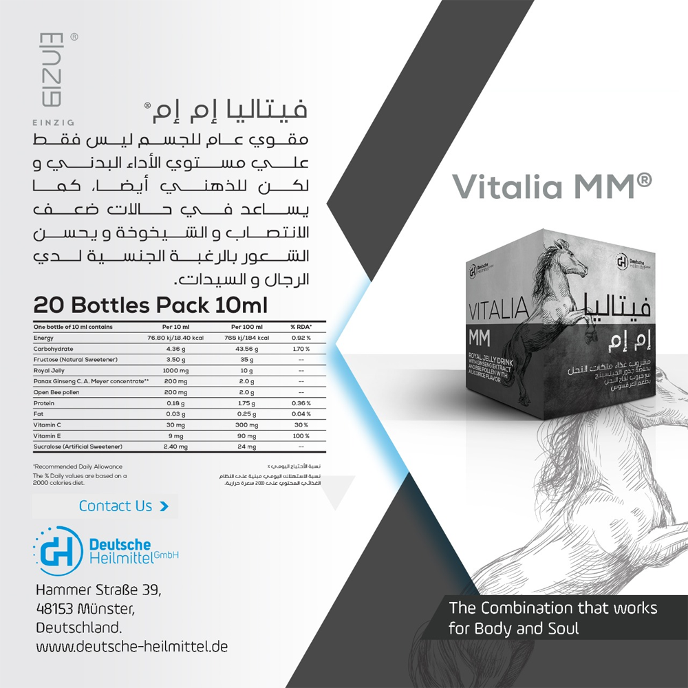 فايتاليا إم إم هو منتج يحتوي على غذاء ملكات النحل، وخلاصة الجينسنج، وحبوب اللقاح، بالإضافة إلى مضادات الأكسدة مثل فيتامين ج وهـ، مما يمنحه القدرة على تعزيز الطاقة والقوة وتعزيز الجهاز المناعي.