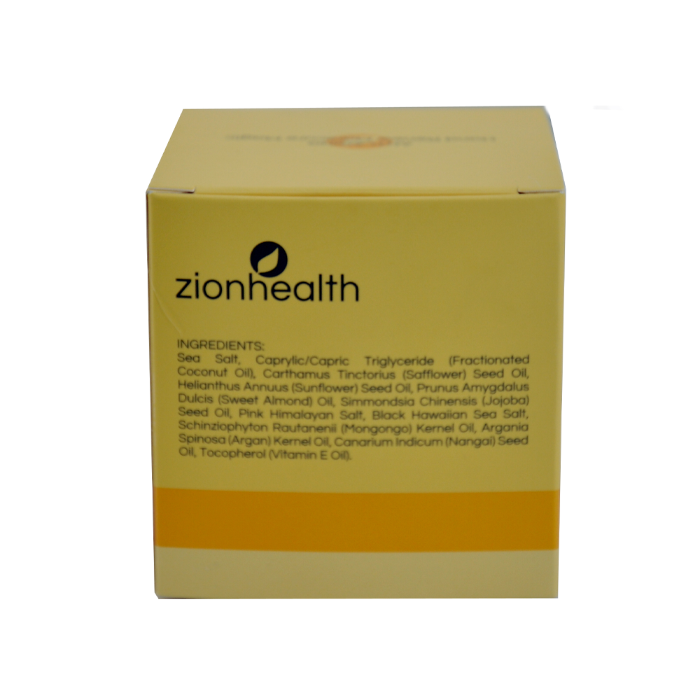 ملح البحر، الدهون الثلاثية الكابريليك (زيت جوز الهند المجزأ)، زيت بذور القرطم تينكتوريوس (العصفر)، زيت بذور هيليانثوس أنوس (عباد الشمس)، زيت برونوس أميجدالوس دولسيس (اللوز الحلو)، زيت بذور سيموندسيا تشينينسيس (الجوجوبا)، ملح الهيمالايا الوردي. ، ملح بحر هاواي الأسود، زيت نواة شينزيوفيتون راوتانيني (مونجونجو)، زيت نواة أرغانيا سبينوزا (أرغان)، زيت بذور كاناريوم إنديكوم (نانجاي)، توكوفيرول (زيت فيتامين هـ).