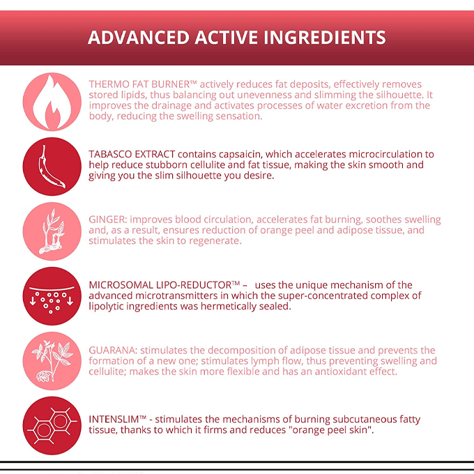 - بتركيبة فعالة للغاية تعمل على تدفئة البشرة لتضمن تغلغل المواد الفعالة لعمق البشرة، مما يسرع من عملية حرق الدهون تحت الجلد.