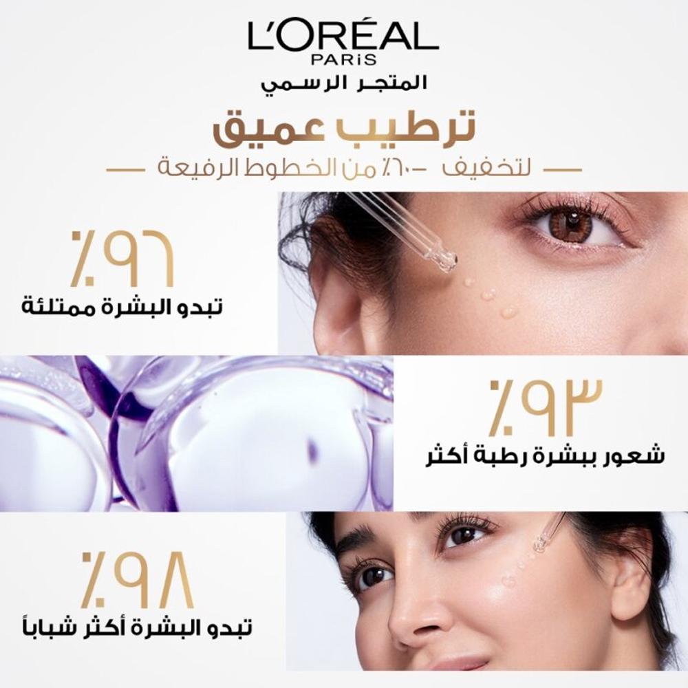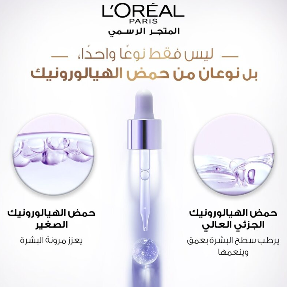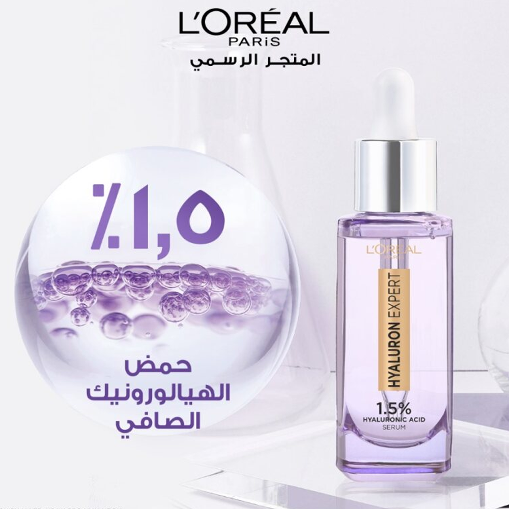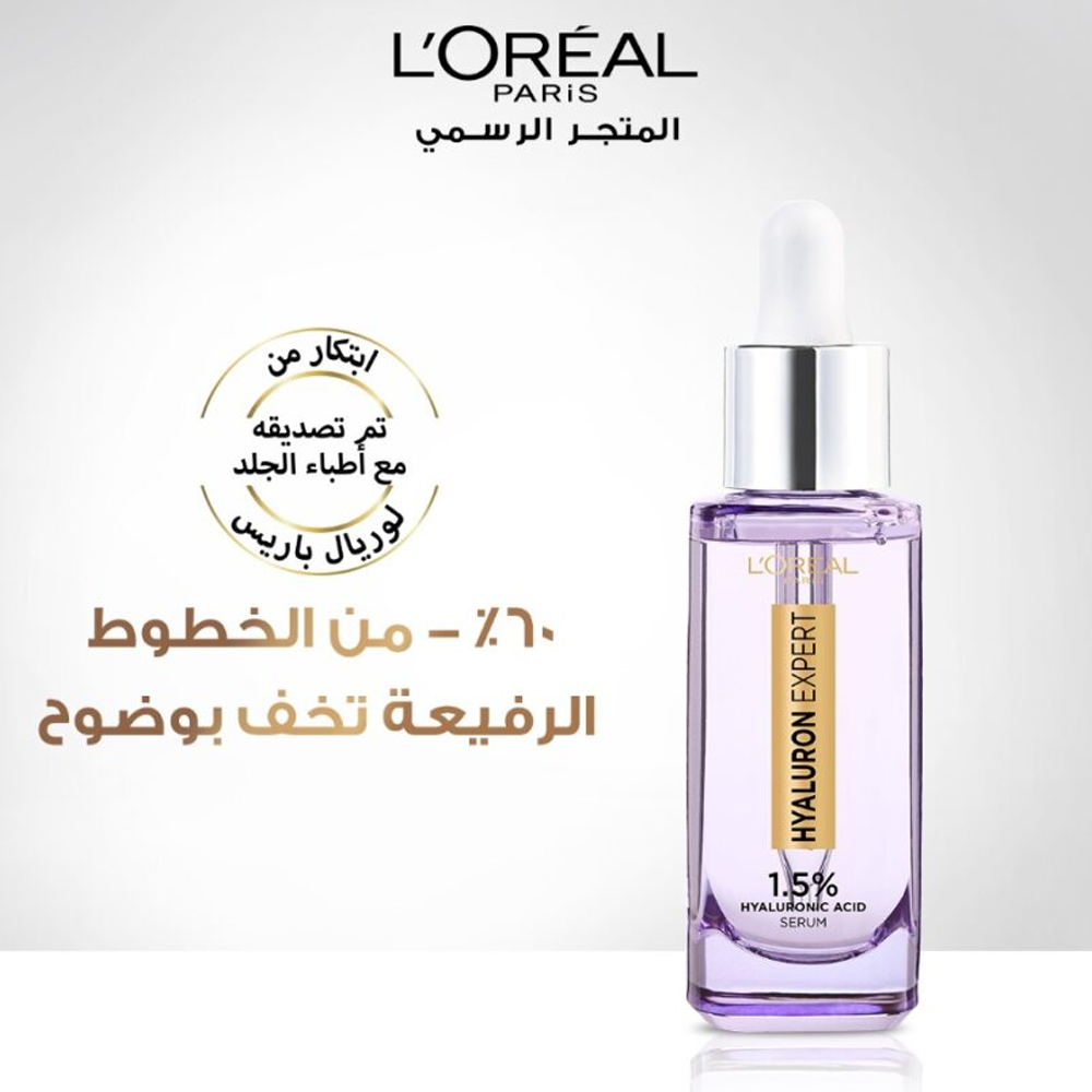 سيروم هيالورون اكسبرت لتعزيز مرونة البشرة مركز ب1.5% من حمض الهيالورونيك يعمل على ترطيب البشرة بعمق و تخفيف مظهر الخطوط الرفيعة 40% بعد ٤ أسابيع.هالورنيك أسيد لوريال يعزز مرونة البشرة و يرطبها بعمق، تمتصه البشرة سريعا ويعطي مظهر نهائي غير دهني. لوريال هالورنيك أسيد يعطي مظهر بشرة مرنة خلال أسبوع واحد فقط كما يعمل على ترطيب البشرة بعمق.