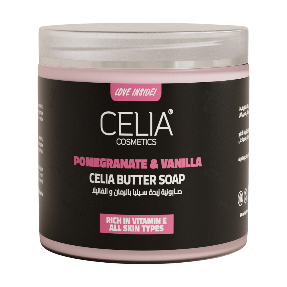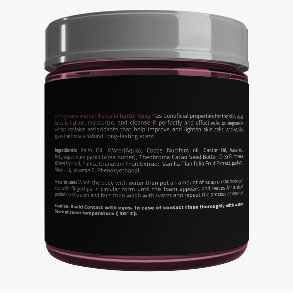 استمتعي ببشرة نظيفة وناعمة مع صابونية زبدة سيليا بالرمان والفانيلا، بتركيبة غنية تجمع بين خلاصة الرمان، خلاصة الفانيلا، زيت جوز الهند، زبدة الشيا، وفيتامين أ، لتمنحك تجربة استحمام فاخرة.