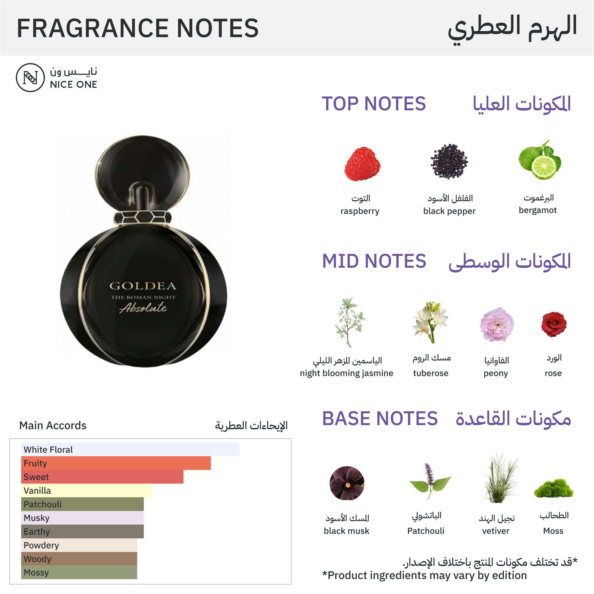 مستوحى من الهالة السحرية للمدينة الخالدة روما، ويجسد جوهر الحياة الليلية في المدينة.زجاجة ملفتة للنظر بتصميمها الأسود والذهبي مما يعكس بريق وأناقة العطر. بولغاري جولديا ذا رومان نايت هو عطر آسر وجذاب مثالي لمن يريد التميز برائحته.عطر زهري شرقي للنساء بدأت قصته عام 2017.