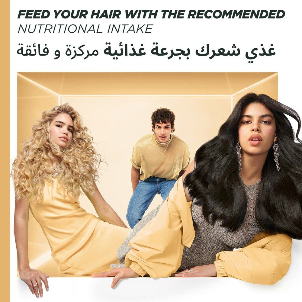يتميز بتركيبة غنية بمستخلصات الأغذية الفائقة للشعر لترطيب عميق يدوم طويلًا.