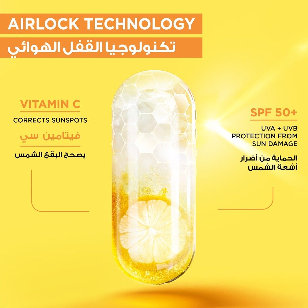 بيوتان، ماء، إيزوبروبيل ميريستات، جلسرين، ثنائي إيزوبروبيل سيباكات، ساليسيلات إيثيل هكسيل، ثنائي إيثيل هكسيلوكسي فينول ميثوكسي فينيل تريازين، بوتيل ميثوكسي ثنائي بنزويل ميثان، بنزوات ألكيل C12-15، درومتريزول تريسيلوكسان، كربونات ثنائي كابريليل، كوبوليمر ستايرين/أكريليت، حمض بارا-أنيسيك، توكوفيرول، أسكوربيل غلوكوزيد، كلوريد الصوديوم، هيدروكسي أسيتوفينون، دوديسيل بنزين سلفونات الصوديوم، هيالورونات الصوديوم، بولي إيثيلين جلايكول-30 ثنائي بولي هيدروكسي ستيرات. PEG-8 LAURATE، PEG-20، إيثيل هكسيل تريازون، ثنائي إيزوبروبيل أديبات، ثلاثي صوديوم إيثيلين ديامين ثنائي سكسينات، نايلون-12، بولي ميثيل سيلسيسكيوكسان، بولي سي10-30 ألكيل أكريلات، ثنائي الميثيكون، ليمونين، لينالول، بروبانيديول، إيزودوديكان، كحول إيزوستياريل، كربونات البروبيلين، كابريليل جليكول، عطر، جيرانيول، ديستيرديمونيوم هيكتوريت، ميثيل ميثاكريلات كروسبوليمر، مستخلص فاكهة الليمون الحمضية/مستخلص فاكهة الليمون، لوريل PEG/PPG-18/18 ميثيكون. كما يُنص على أن “فيتامين سي جي = مشتق من فيتامين سي”.