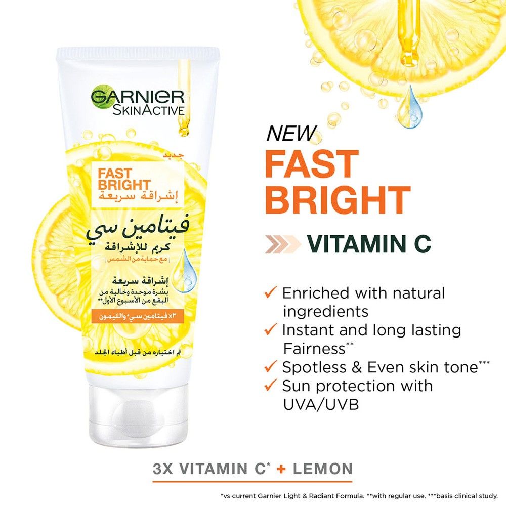 يمتص غارنييه كريم تفتيح بفيتامين سي بشكل أسرع لتخفيف 3 أنواع من البقع بصورة ملحوظة البقع الداكنة، والبقع الناتجة عن الأشعة فوق البنفسجية، وبقع البثور.