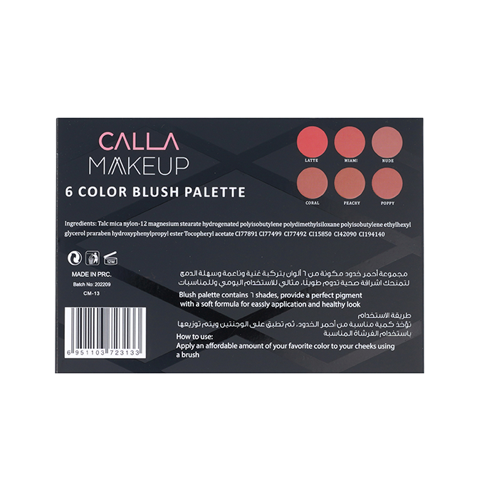 أكملي إطلالتك بأحمر خدود بألوان جميلة تدوم طويلا مع مجموعة البلاشر من كالا ميك اب.تحتوي على 6 ألوان مختلفة من أحمر الخدود.تركيبة بودرة ناعمة تنساب على الوجه بسلاسة.يمكن وضع كل لون على حده أو دمج الالوان و الاستمتاع بمظاهر مختلفة.تتميز بقوام خفيف ولون غني بلمسة واحدة.تدوم لساعات طويلة دون أن تتلاشى خلال اليوم.