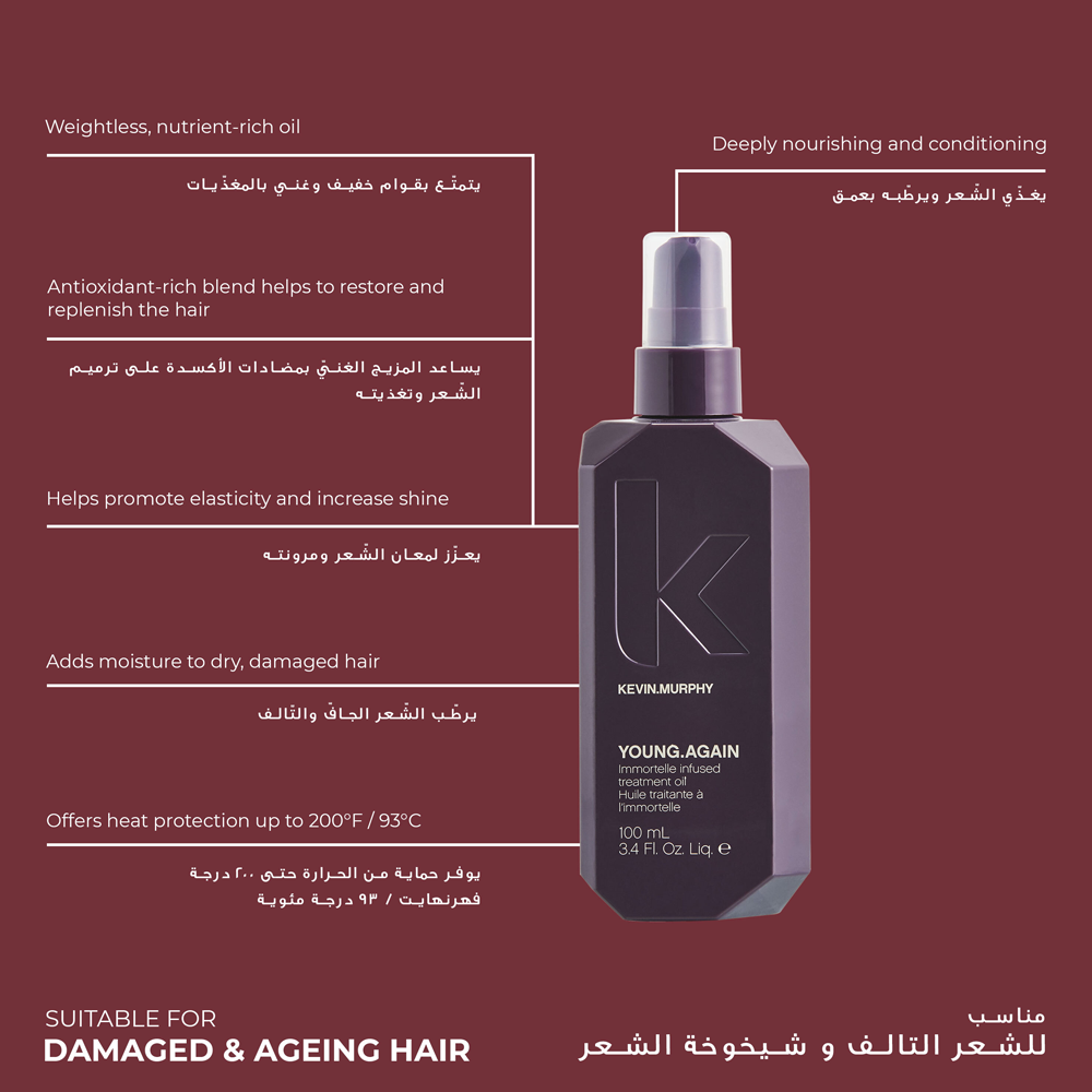 زيت كيفن مورفي يونج اقين مصمم لحماية الشعر من أضرار الحرارة والعوامل البيئية، بفضل تركيبته الغنية بمضادات الأكسدة ومرشحات الأشعة فوق البنفسجية.