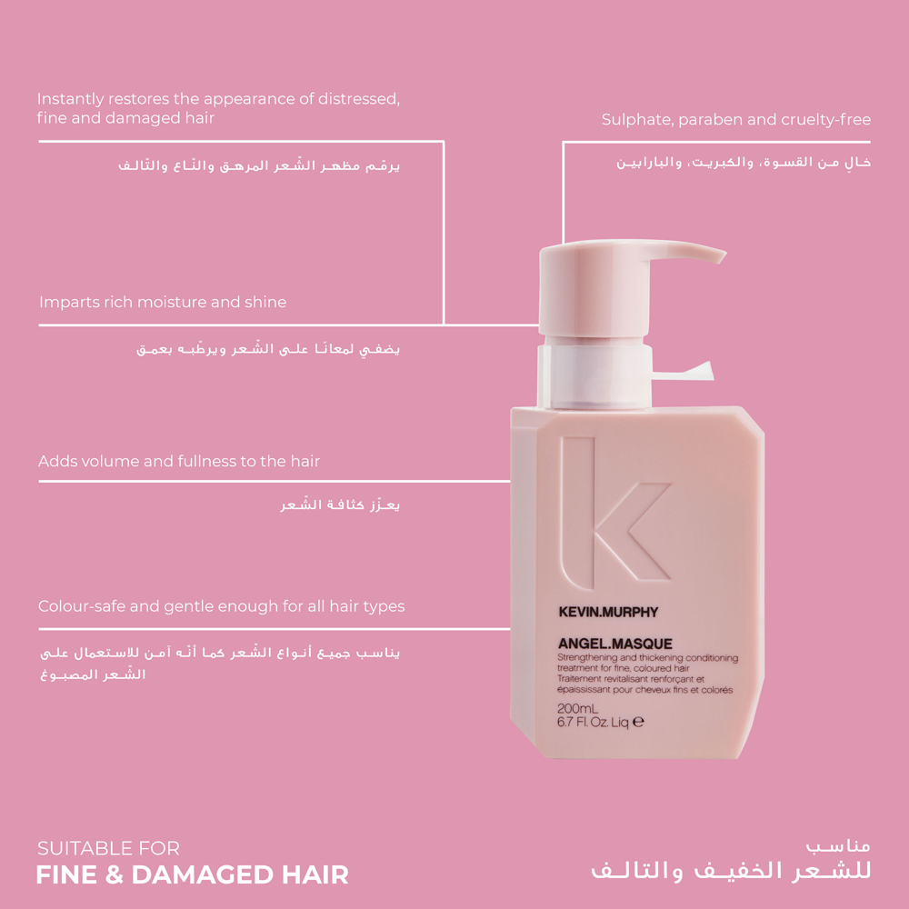 كيفن مورفي اينجل ماسك  هو الحل المثالي للشعر الناعم والمعالج بالألوان الذي يحتاج إلى الترطيب والتقوية.