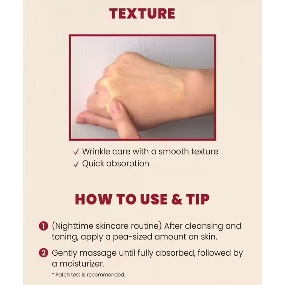 يحتوي على 2% من ريتينال ليبوسوم الفعّال يساعد على تقليل التجاعيد وتحسين ملمس البشرة.يدعم إنتاج الكولاجين الطبيعي، مما يُحسن من تماسك البشرة ومرونتها، ويقلل من الترهل بمرور الوقت.يقلل من التصبغات والبقع الداكنة، ليمنح بشرتك إشراقة موحدة ونضارة طبيعية.بفضل احتوائه على 58% من مستخلص الجينسنغ الأسود،.يوفر حماية فعالة ضد العوامل البيئية الضارة، ويساعد على تهدئة البشرة وتقليل الالتهابات.يغذي البشرة ويرطبها من الأعماق، ليحافظ على نعومتها وإشراقها طوال اليوم.تركيبة مصممة بعناية لتناسب حتى البشرة الحساسة، مما يجعلها مثالية للاستخدام اليومي.