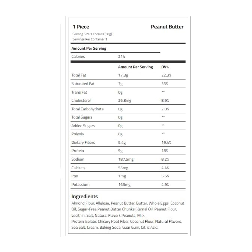 دقيق اللوز، أليولوز، زبدة الفول السوداني، زبدة، بيض كامل، زيت جوز الهند، قطع زبدة الفول السوداني الخالية من السكر (زيت الجوز، دقيق الفول السوداني، ليسيثين، ملح، نكهة طبيعية)، فول سوداني، عزل بروتين الحليب، ألياف جذر الهندباء، دقيق جوز الهند، نكهات طبيعية، ملح البحر، كريمة، بيكربونات الصوديوم، صمغ الغوار، حمض الستريك.