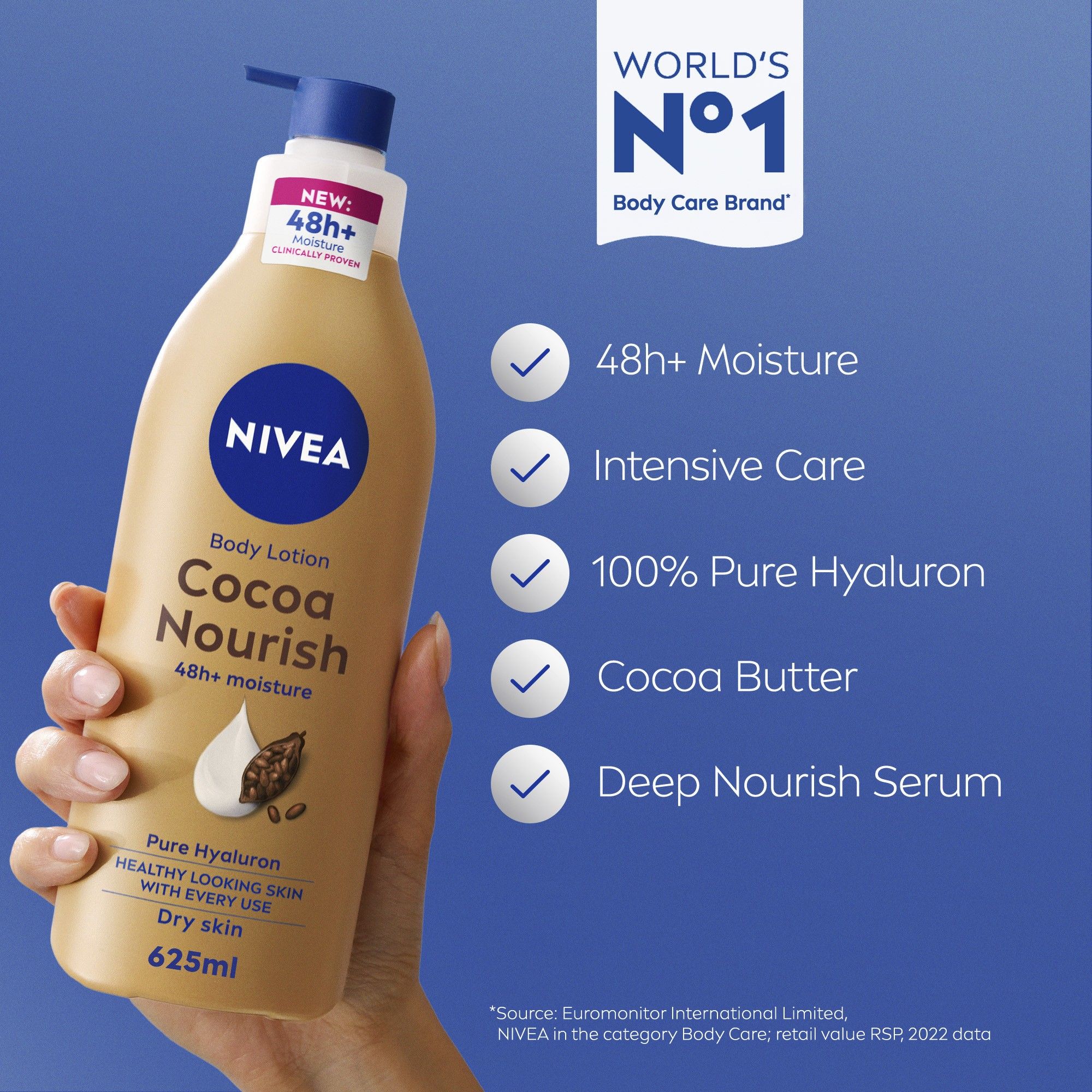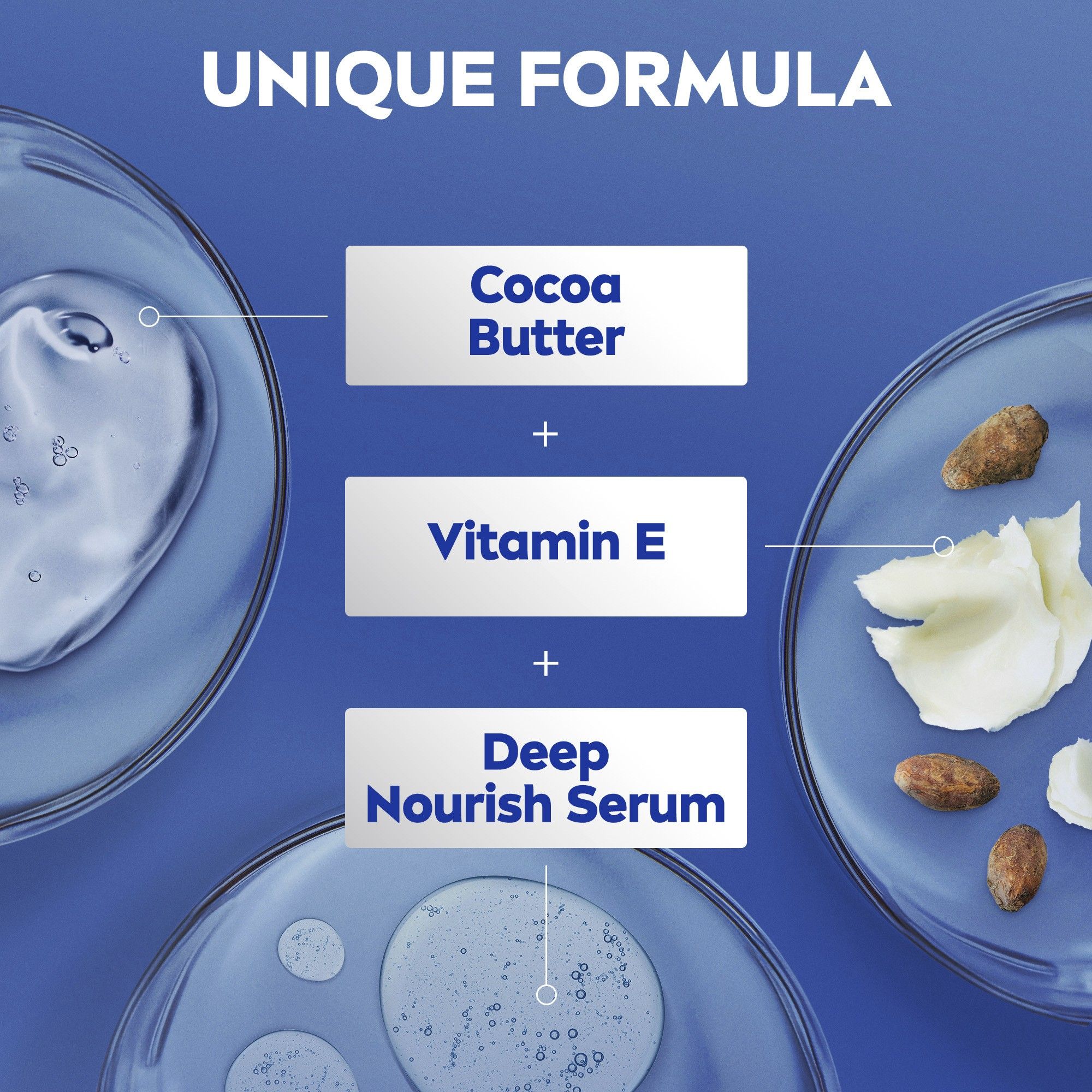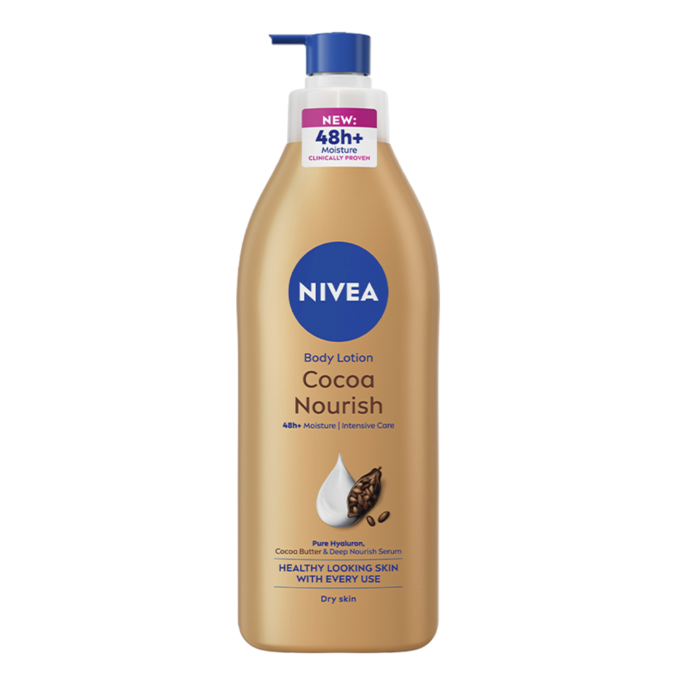 لوشن مرطب للجسم غني بزبدة الكاكاو الفاخرة وسيروم الترطيب العميق من نيفيا.