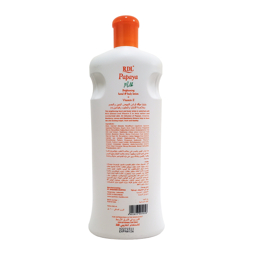 لوشن تفتيح اليدين والجسم بالحليب وخلاصة البابايا وفيتامين إي من ار دي ال – 600مل