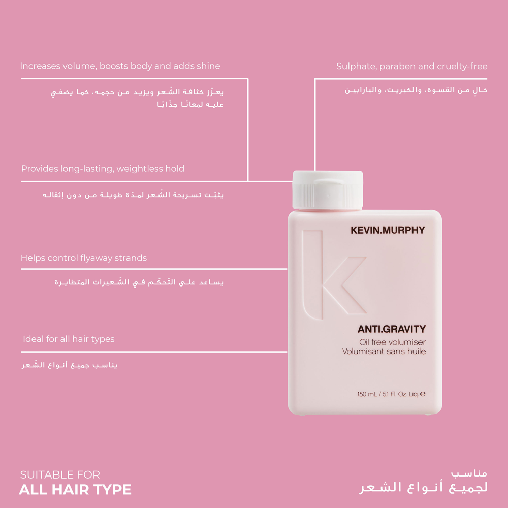 يساعد آنتي جرافيتي الخالي من الزيت من كيفن مورفي في إضافة حجم ولمعان وملمس للشعر بفضل تركيبته الخفيفة، مما يضفي الحيوية على تسريحتك دون أن يسبب الجفاف أو التلف.