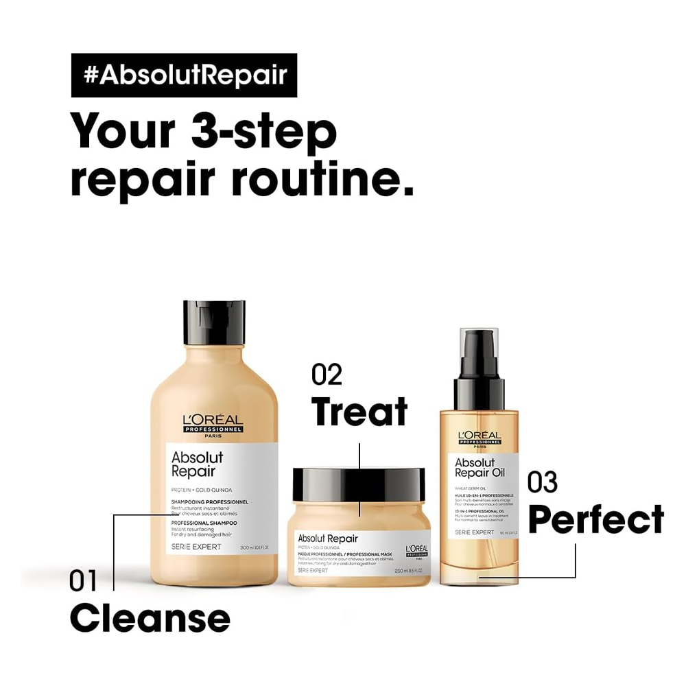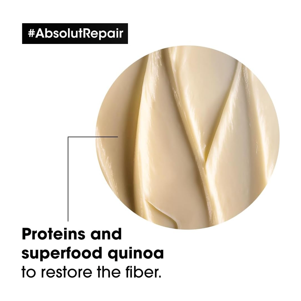 احمي شعرك واستمتعي بشعر أكثر لمعاناً ونعومة مع ماسك ابسولوت ريبير للشعر من لوريال بروفيشنال.تركيبة غنية بالبروتين والكينوا توفر تغذية مثالية للشعر.يعمل على تجديد الشعر وتغذية الشعر الجاف والتالف.يتميز بقوام كريمي كالزبدة سهل التطبيق.