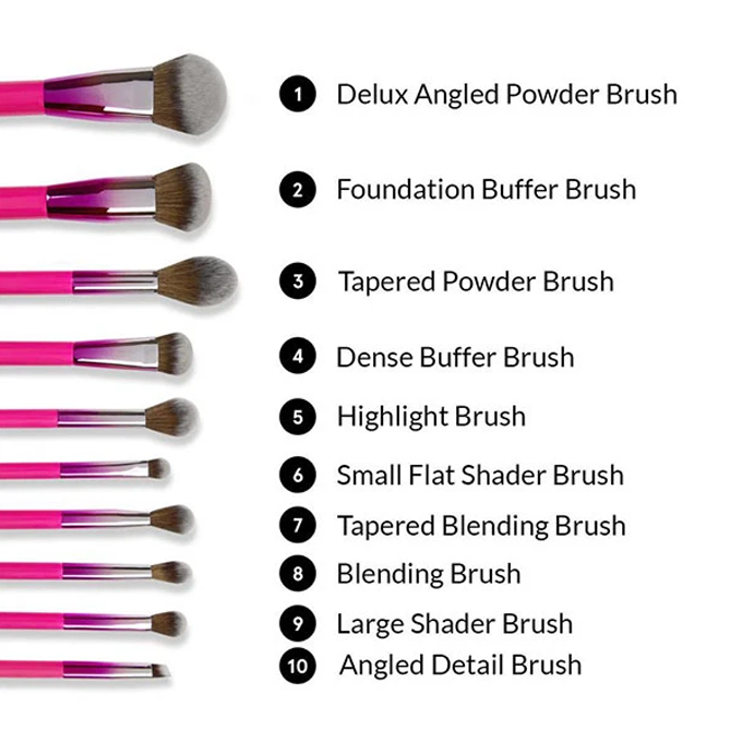 تحتوي على 10 أنوع فرش توفر جميع احتياجاتك للمكياج، بالإضافة الى حقيبة أنيقة مصنوعة من الجلد الصناعي تستخدم لتخزين وحماية الفرش.