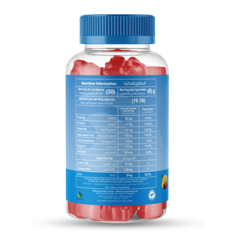 مذرنيست حلوى لوتين مع زيازانثين وزنك بنكهة البرتقال والمانجو والتوت المشكل هي خيار رائع لدعم صحة العين والمناعة.يحتوي اللوتين وزيازانثين على مضادات أكسدة تساعد في حماية العين من الأضرار الناتجة عن الأشعة الزرقاء.غني بالزنك الذي يلعب دورًا مهمًا في تعزيز صحة المناعة ويدعم وظائف العين.