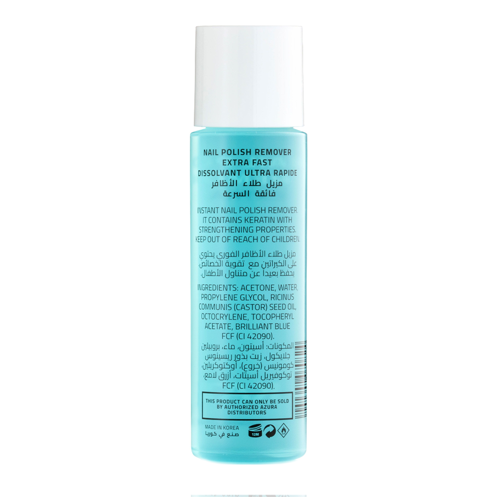 يزيل جميع أنواع طلاء الأظافر بطريقة احترافية للغاية، بفضل تركيبته الفعالة وسريعة المفعول.غني بزيت الخروع وزيت بذور الريسينوس للعناية بالأظافر وحمايتها. يساعد على تحسين مظهر الأظافر أثناء إزالة الطلاء.