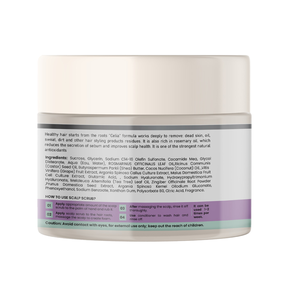 مقشر فروة الرأس بإكليل الجبل واللافندر غني بمكونات طبيعية مثل سكر طبيعي، زيت إكليل الجبل، زيت اللافندر، زبدة الشيا، حمض الهيالورونيك، وزيوت الأرغان واللوز والجوجوبا، ليمنح فروة رأسك تنظيفًا عميقًا وإزالة فعالة للخلايا الميتة والشوائب، مع تقليل إفراز الدهون وتحسين صحة الفروة.