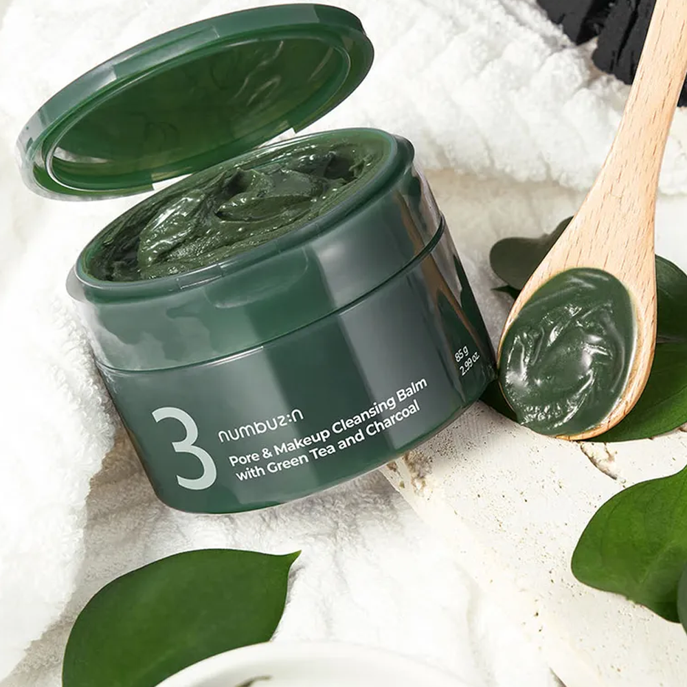 بلسم التنظيف نومبوزين.3 للمكياج وفتح المسام يجمع بين فوائد الشاي الأخضر والفحم النشط لإزالة المكياج والشوائب بفعالية، كما يساهم في فتح المسام.