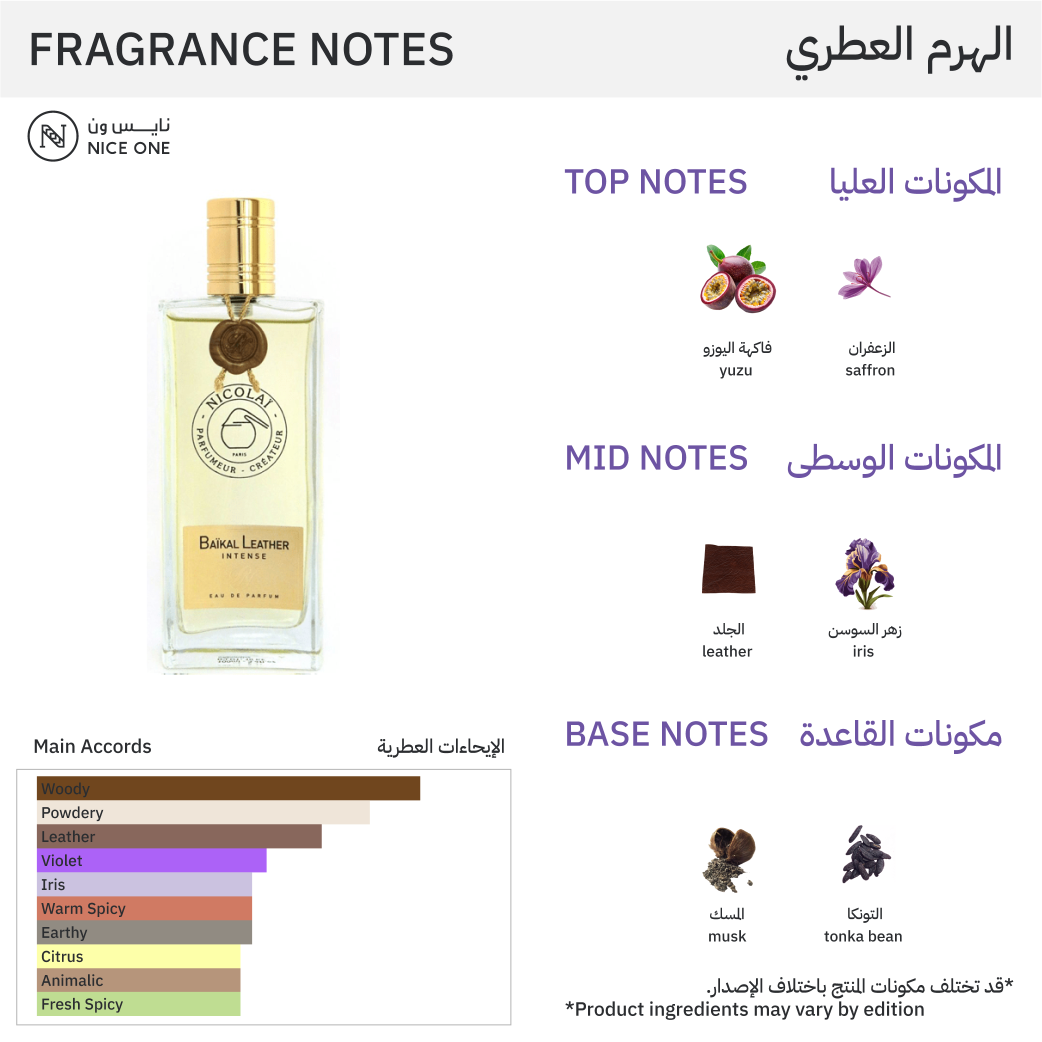 - المكونات الوسطى: الجلد، أخشاب البتولا، البنفسج,، الورد، زهور السوسن.
