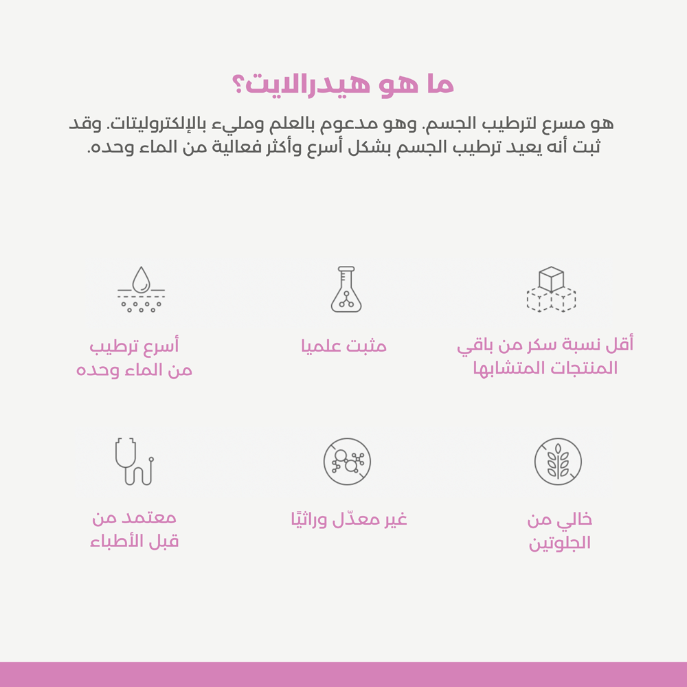 هيدرالايت يستخدم تركيبة خاصة تحتوي على كمية محددة من الجلوكوز والالكتروليتات لترطيب الجسم بشكل أسرع من الماء وحده.