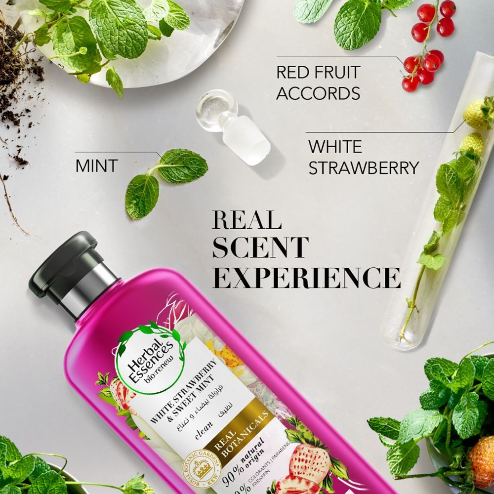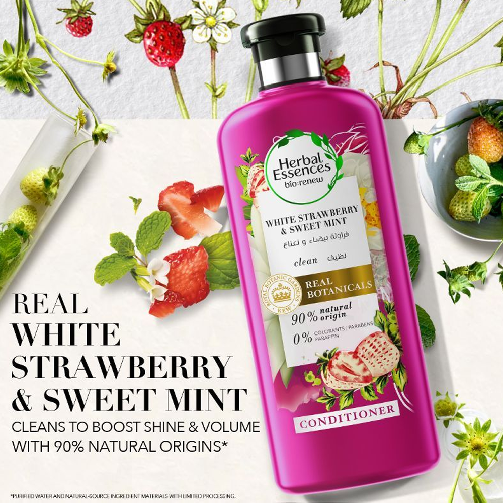 استمتعي بعناية شعر منعشة مع بلسم هيربل إيسنسز بالفراولة الأبيض والنعناع الحلو.