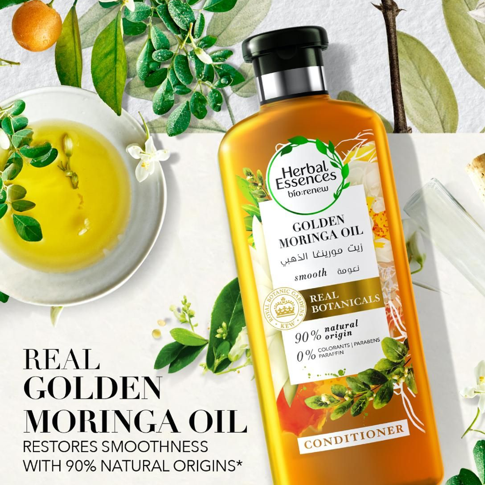 احصلي على شعر ناعم وحريري مع بلسم هيربل إيسنسز بزيت المورينغا الذهبي.