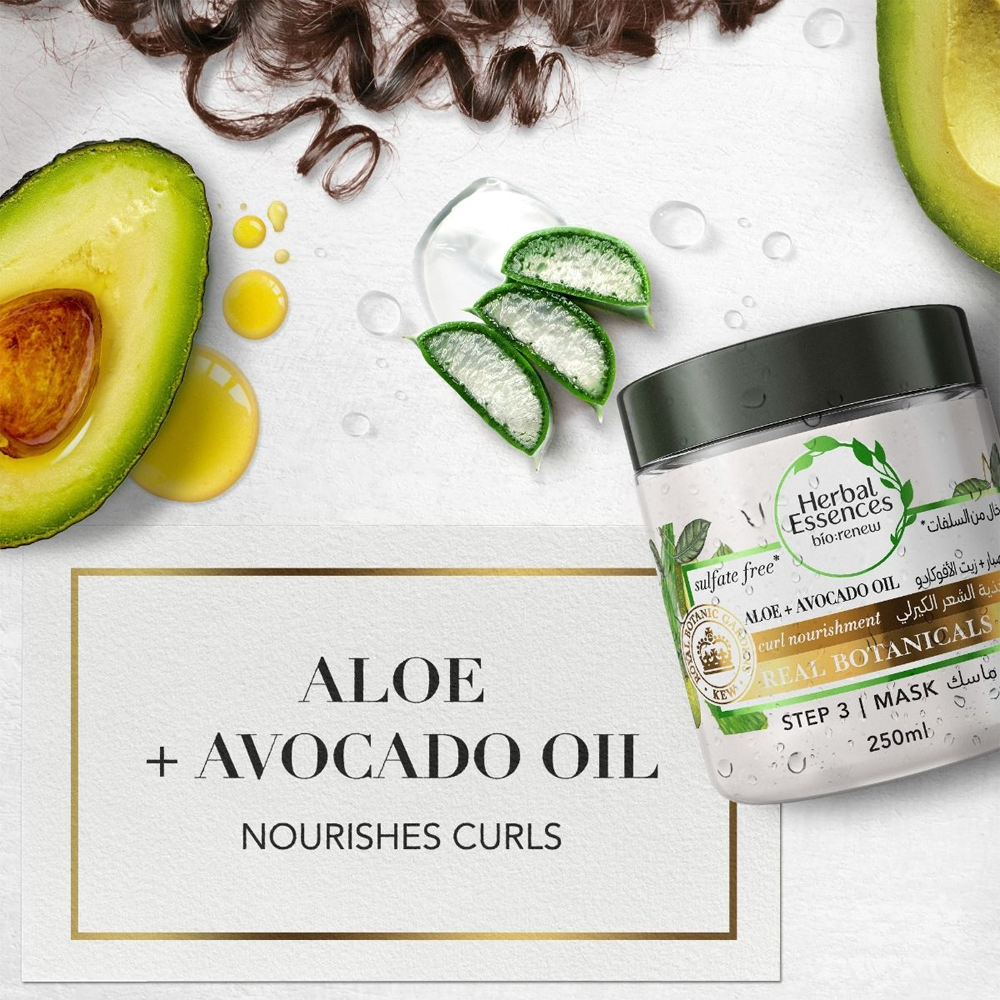 امنحي تجعيدات شعرك تغذية مكثفة مع ماسك هيربل إيسنسز بالصبار وزيت الأفوكادو.